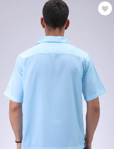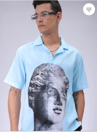 This The Indian Garage Co Men Blue Oversized Fit Graphic Shirt has a Cuban Collar, Half Sleeves and Button Closure.
