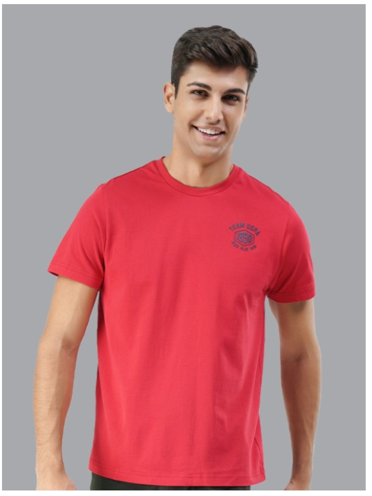 Red, black and white colourblocked lounge t-shirt, has a round neck, sleeveless