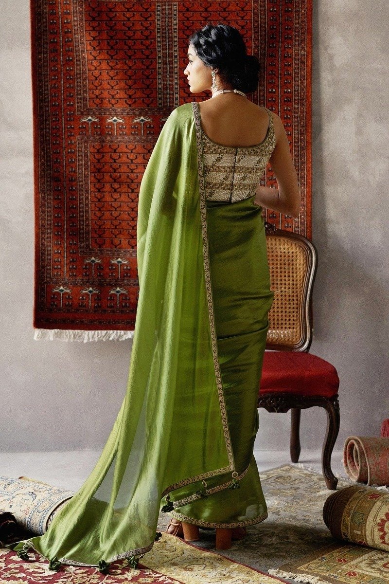 Olive Green Saree Comes with an Embroidered Blouse