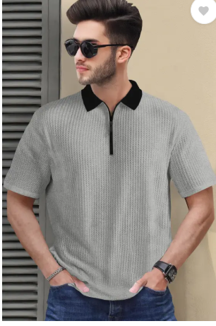 Men Self Design Polo Neck Cotton Blend Grey T-Shirt