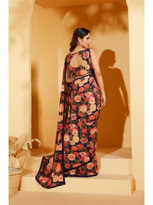Multicolor Floral Print Saree with Petticoat and Blouse with Stitched