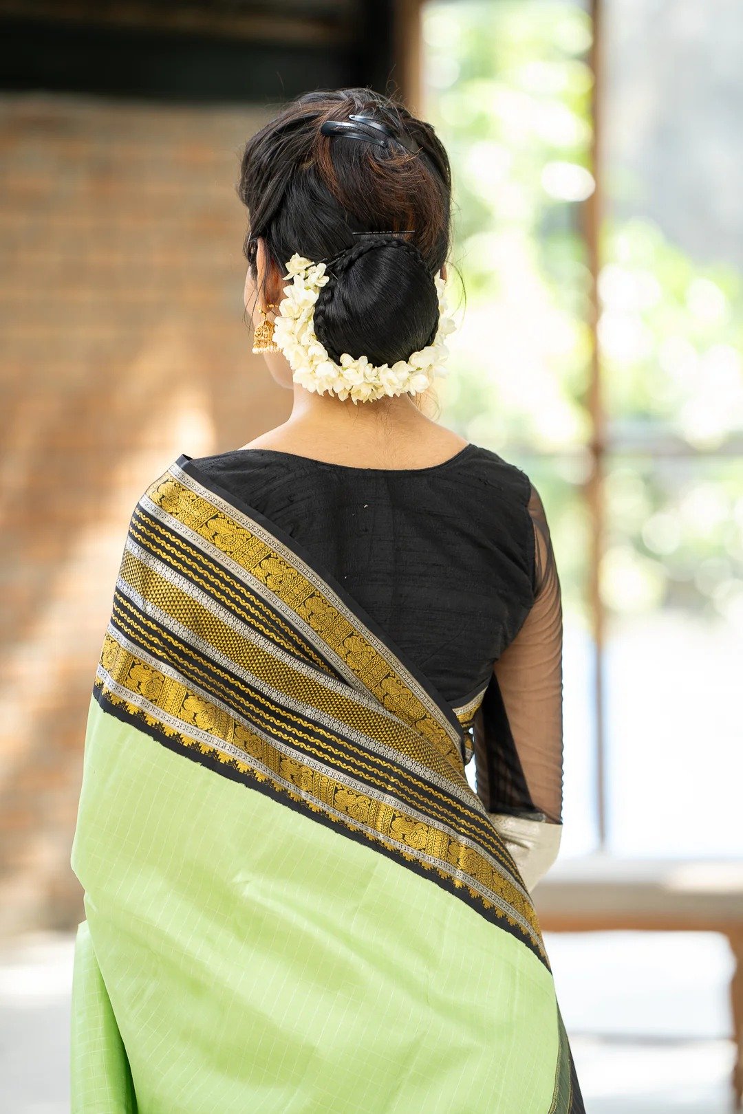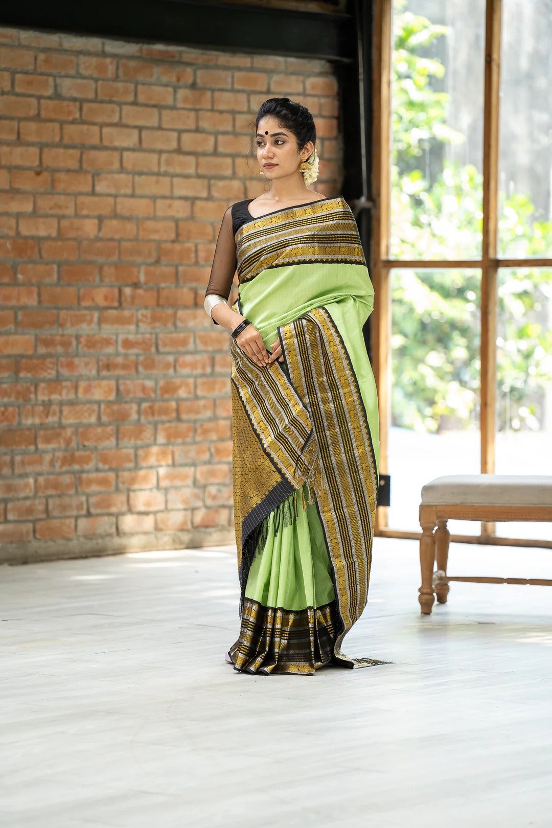 aturing the stunning Spring Green pure handwoven Kanchipuram silk saree is a timeless example of Indian craftsmanship. Woven with an intricate korvai varisaipettu border decorated with black gold and silver traditional motifs. It is a truly traditionally spectacular Saree. Complete the look with a designer blouse for a sophisticated appeal.