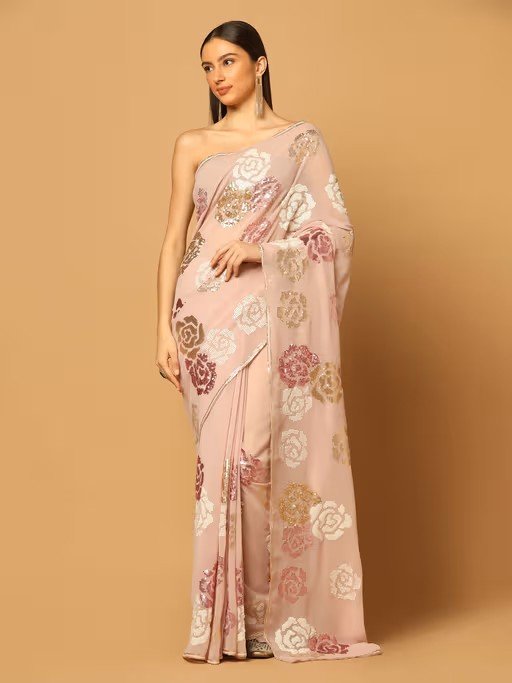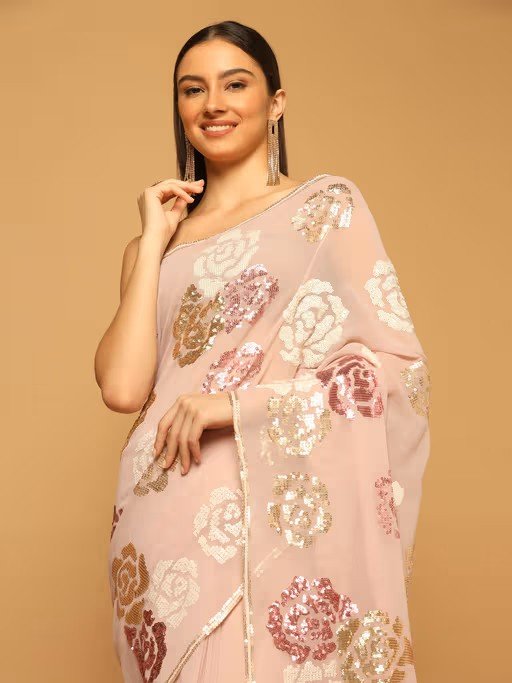 Pink Floral Sequins Embroidered Saree with Stitched Blouse