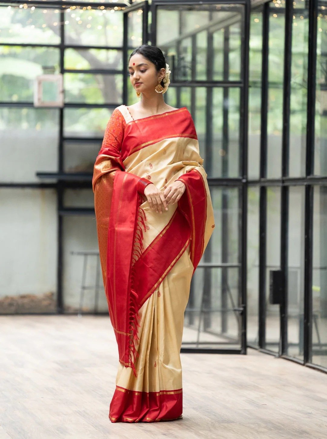 Featuring the timeless Kanchipuram in cosmic latte cream is a beautiful amalgamation of contemporary and traditional craftsmanship. Expertly hand-woven, the body is adorned with stunning paisley motifs in zari and thread and framed with a red pattu korvai border and diamond pallu.