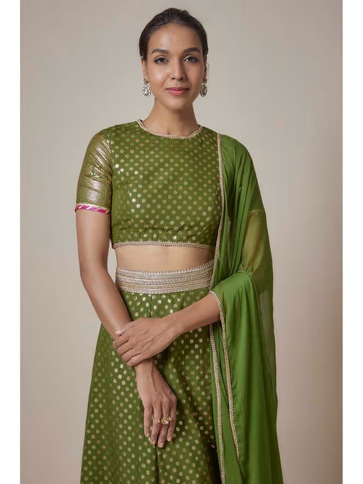 Breeze In And Out Of Festive Gatherings In Our Microfoil Print Lehenga Sets That Are Sure To Become Your New Favourite This Season. Crafted In 100% Recycled Polyester, This Ensemble Is Destined To Become Your Go-To Festive Staple, Allowing You To Effortlessly Pair It With Your Most Comfortable Footwear And Accessorize With Stunning Gold Accents. Like All Of Our Pieces, This Piece Is Made In India And Checked By Hand To Ensure High Quality. Styled With A High Neck Elbow Sleeve Printed Blouse In A 100% Recycled Polyester Base With Gota Edge Lace Details And Back Metal Zipper. Styled With Our Chiffon Dupatta With Lace Detailing.