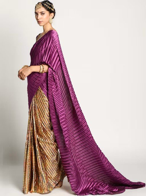 The multicolored chanderi half and half saree played with heat set pleated fabric