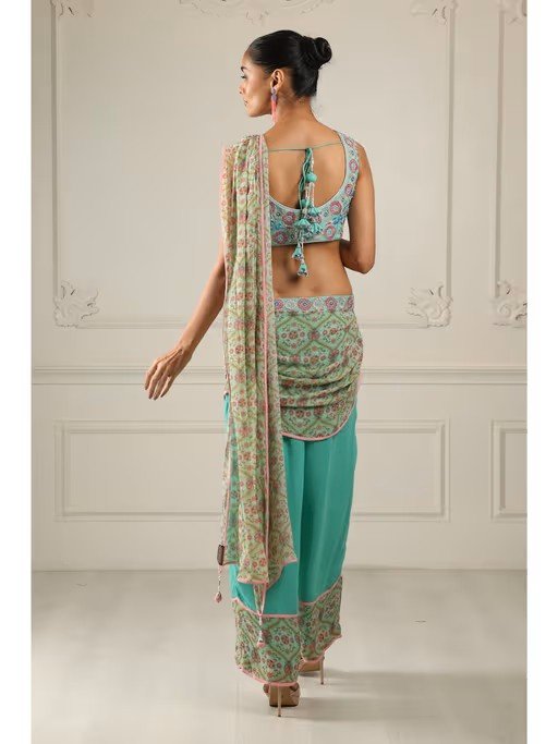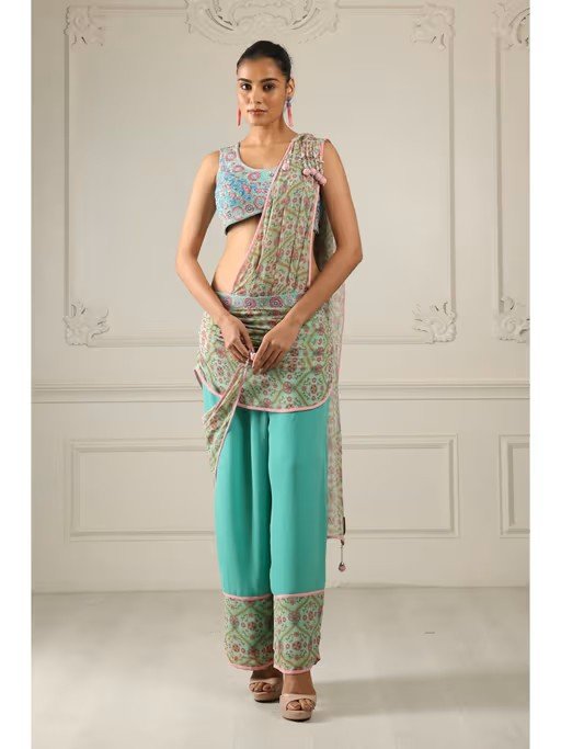 Channel your inner diva with this saree from House of Supriya. Crafted from georgette fabric. It features an exquisite printed design, finished with a stitched blouse and a chic dupatta. Style it with a pair of heels and diamond earrings for an elegant and soft look.