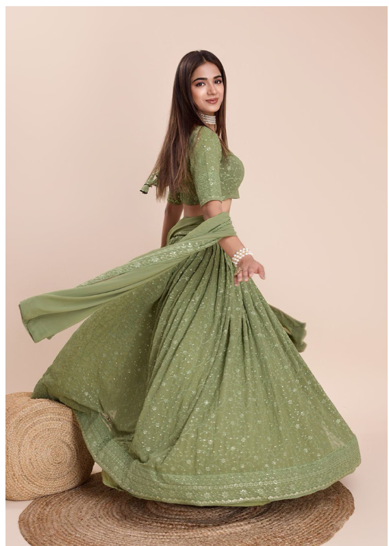 Step into elegance with this stunning Green Sequin Thread Embroidered Faux Georgette Lehenga Set, designed to turn heads at every celebration. A beautiful blend of tradition and trend, it's your perfect pick for any grand event.
