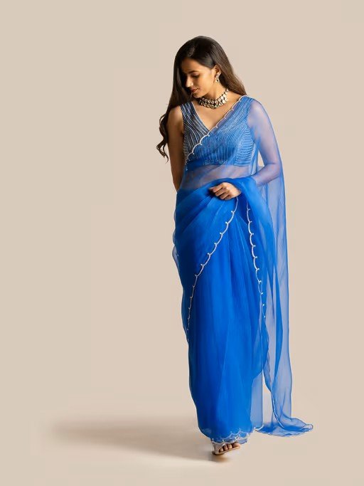 This Royal blue Organza hand Embellished blouse with Saree which has work in the border is ready to make you shine. Blouse length:13",Set of 2
