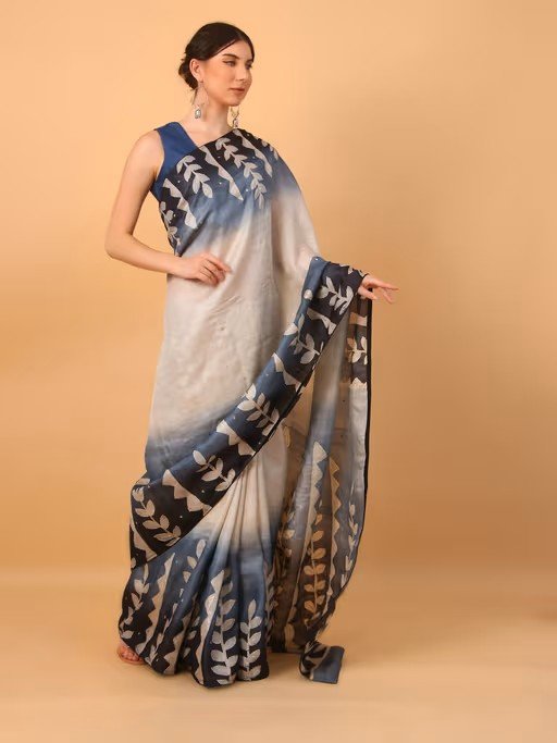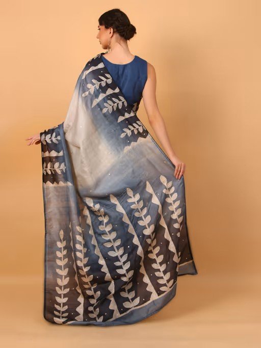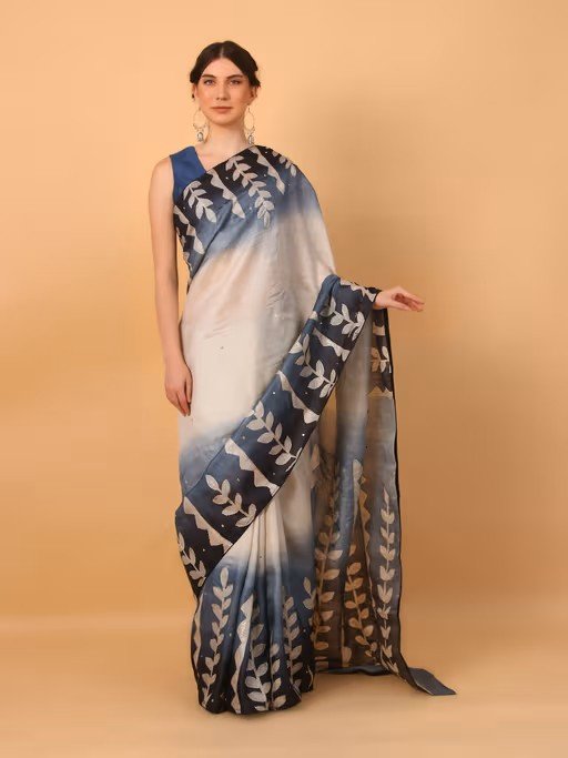 Blue Patchwork Printed Saree with Unstitched Blouse