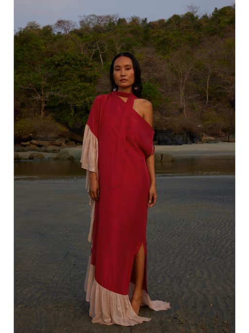 Maximize your style with this red kaftan dress from Twinkle Hanspal. It is tailored from high-quality silk fabric. This kaftan dress features flared sleeves, off shoulder, a slip-on closure and solid pattern. Complete the look with minimal jewellery and heels for elegant yet chic look.