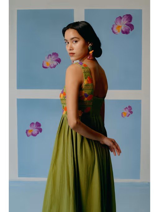 Olive Green Scoop Neck Gathered Dress With Texture Embroidery On Yoke And Lace Applique On Bottom Flare. Fit: Regular Fit. Garment Length: 55" Inches model Info: Height: 5 Ft. 7 In. | Wearing Size Swash Care: Cold Water/Hand Wash