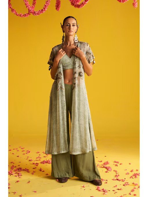 This Set Includes A Long Embroidered Cape, A Coordinated Blouse, And Flared Pants. The Cape Features Floral Embroidery Along The Front And Back, While The Blouse Has Subtle Patterns. The Flared Pants Complete The Ensemble With A Graceful Silhouette, Blending Traditional Elegance With Modern Style.
