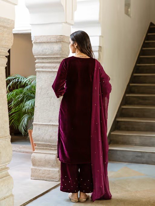 VOur Roya Set Is Dipped In A Vintage Glam Neck With Antique-Inspired Zardozi, Moti Daba And Cutwork Embellishments.This Is A 3 Piece Set. Kurta -A Hand-Dyed Velvet Kurta Is Embellished With Zardozi And Moti Daba Work Pant - It Is Paired With Matching Velvet Silk PantsDupatta - A Matching Organza Dupatta With Cut Work Embroidery Completes The Look.