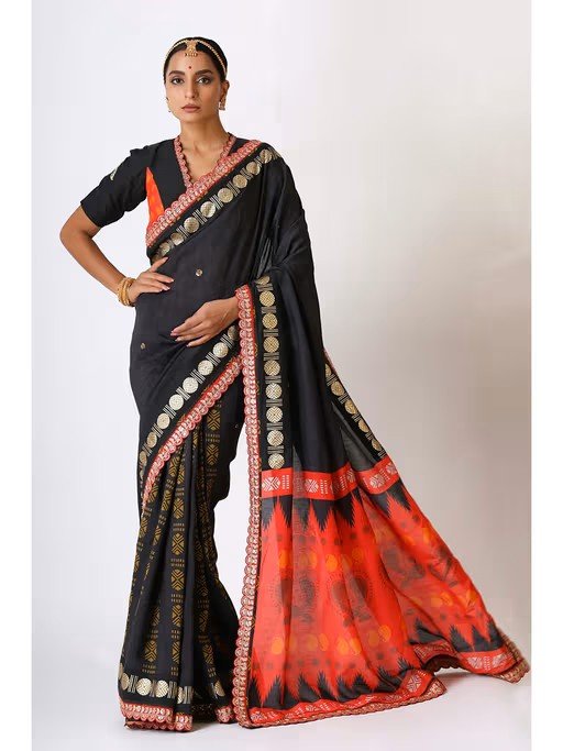 The Saree Is A Contemporary Take On Traditional Kanjeevarm Motifs And Design Philosophy. The Saree Combines Multiple Techniques Like Digital Print, Screen Print And Embroidery. The Saree Is A Statement Piece With The Eternally Classic Black And Red Colours.
