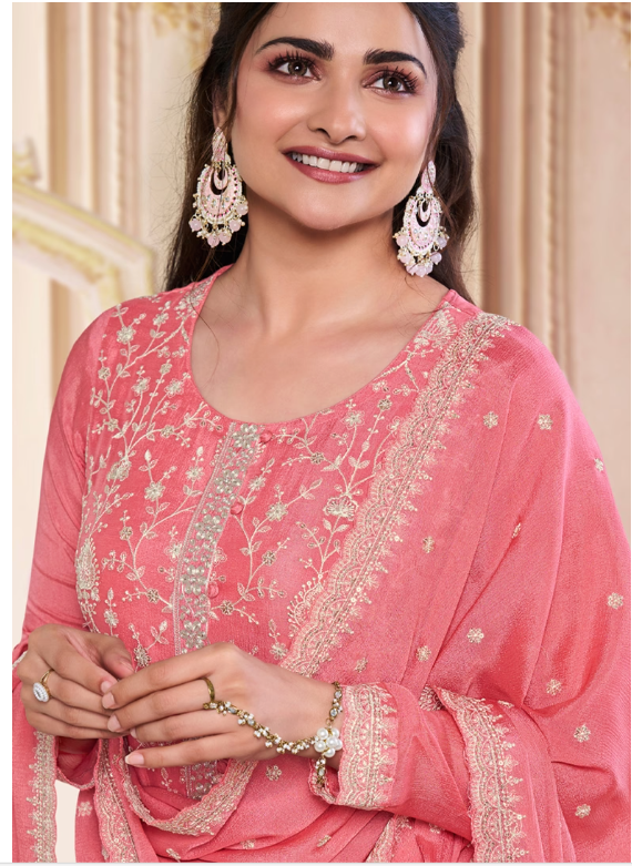 Peach Thread Sequin Embroidered Chinon Kurta Set