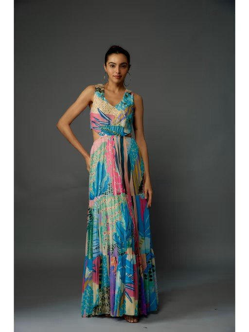 Embrace elegance by stepping out in this captivating aqua tropical print art georgette embellished cut-out dress from PS Pret by Payal Singhal. Made from high-quality georgette, this piece features a sleeveless design and a v-neck. Style it with minimal jewellery and sandals to complete the ensemble.