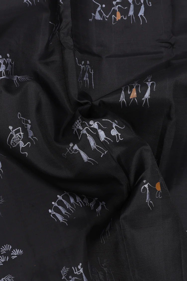Exquisite kanchipuram silk saree in a striking black hue, adorned with intricate Warli tribal art motifs. This handcrafted masterpiece combines the luxurious texture of traditional kanchipuram silk with contemporary design elements, creating a sophisticated statement piece for discerning connoisseurs of fine textiles. Perfect for elegant occasions that demand both cultural significance and refined aesthetics.