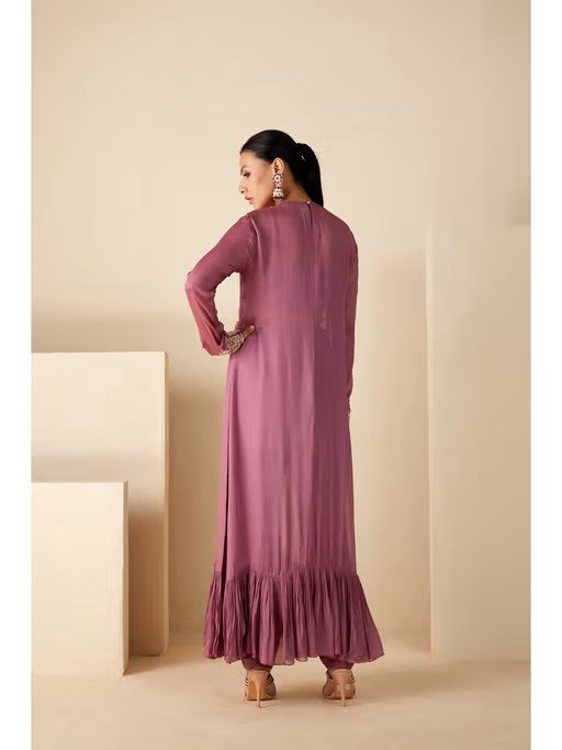 Adorn the styles specially made for you with this mauve set from Suruchi Parakh. Made from high quality georgette, it features button fly closure and embroidered pattern along with full sleeves & round neck design. Pair it with trendy footwear to elevate your look.• Return Eligibility: Returnable within 15 days of delivery