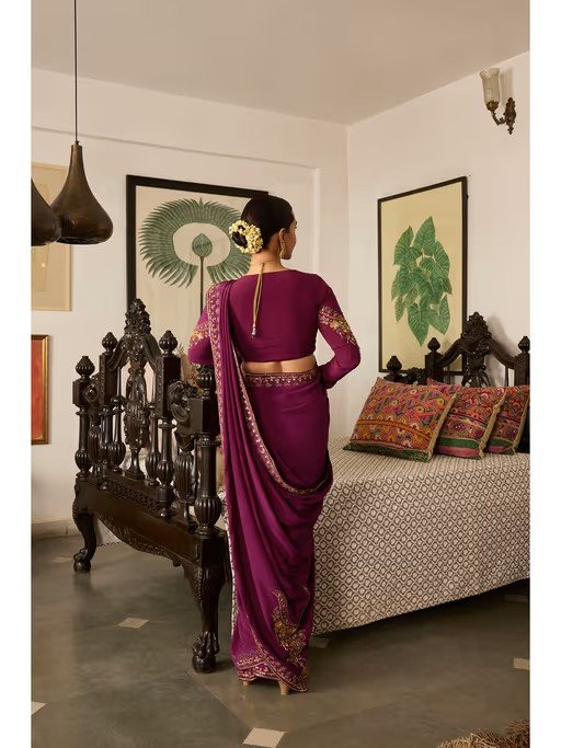 Purple Embroidered Crepe Saree with Hand Embroidered Blouse