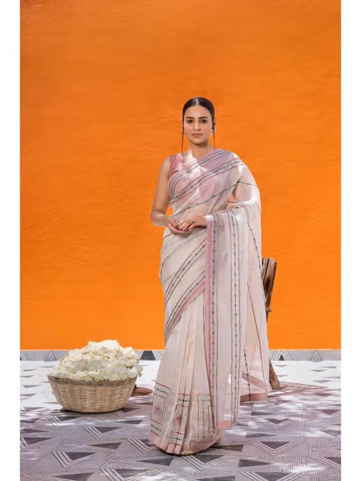 Ivory Organza Saree, Adorned with Resham and Aari Box Motifs Throughout, Creating A Delicate Yet Intricate Design. The Pallu Features Stripes Work, Adding A Contemporary Flair To This Traditional Attire. Paired Elegantly with A Pink Chanderi Blouse, This Ensemble Captures Timeless Charm with A Modern Twist.