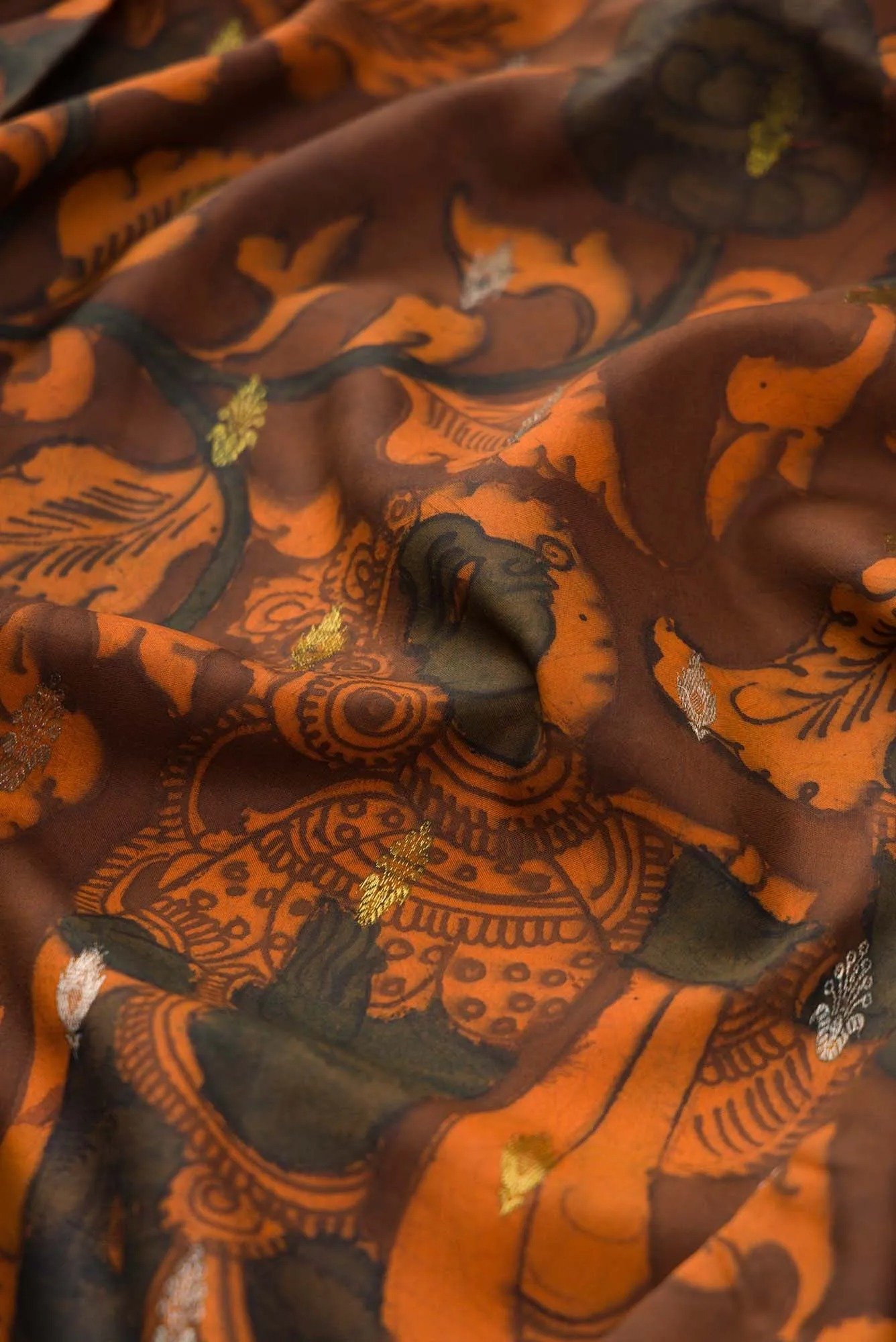 Brown Dual Tone Kanchipuram Silk SareePrinted design on the body and Zari Border. Includes unstitched blouse.