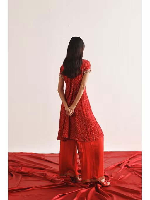 Effortlessly stylish, this Twenty Nine's red maro iwork crushed bandhani kurta with palazzos and dupatta blends classic charm with modern ease. It is crafted from high-quality fabirc. It features half sleeves and round neck style. It's the epitome of understated elegance, perfect for festive, wedding, or special occasions.