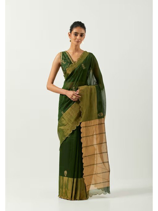 To look beautiful this wedding season, grab this lovely green saree blouse set. It is crafted from premium quality. It features embroidered pattern with sleeveless, v-neck style. Pair it with matching jewellery and heels for the gorgeous look.