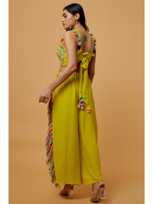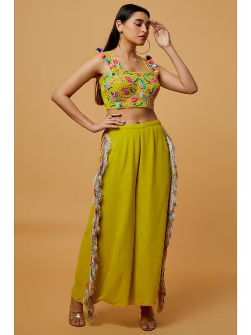 Embrace elegance by stepping out in this captivating lime green embroidered bustier with cropped culotte palazzo from PS Pret by Payal Singhal. Made from high-quality georgette, this piece features a sleeveless design and shoulder straps. Style it with minimal jewellery and sandals to complete the ensemble.