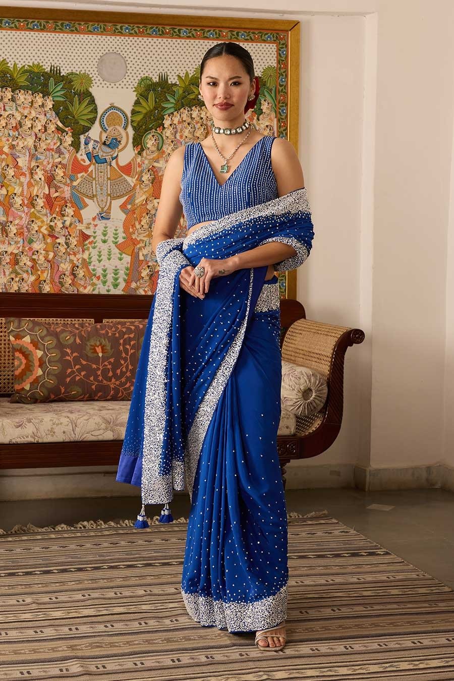 Blue Embroidered Crepe Saree