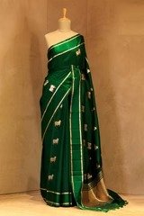 This Bottle Green Banarasi silk saree is a handloom masterpiece featuring gold and silver zari woven Pichwai Aghanya (cow) motifs across the body woven with pure Puna silk. The saree is accentuated with a silver and gold zari-striped border on a satin base and complemented by an ethnic brocade pallu. It comes with a matching unstitched blouse piece for custom styling.