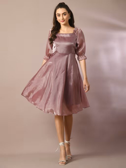 Brown Solid Square Neck Fit and Flare Party Dress