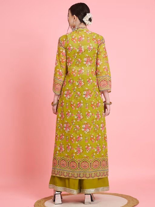 Women's Shrug Style Printed Embroidered crop Top Palazzo Shrug Set For Women. Crop (top) Fabric: Viscose Rayon || Crop (top) Style: Crop Top || Crop (top) Length: 9 Inches || Pattern: Lace Work Colour: Parrot-Green || Sleeve Type: Shrug Sleeve: 3/4 Sleeves || Sleeve Length: Shrug: 18 Inches || Neck Type: Round Neck Embroidered Top With Palazzo and Shrug Set For Fusion. Product Type: Top Choli With Shrug And Palazzo Fusion Set || Wear on Party wear, Wedding wear Festive wear, Traditional wear, Ethnic wear, Fusion Wear, Classic Wear, Anniversary, Birthdays, Kitty Parties, Outings, Engagement, Baby Shower. Gift: Special Gift, Birthday Gift, Anniversary Gift, Engagement Gift, Valentine's Day Gift for Girlfriend, Gift for Wife, Valentine's Day Gift for Wife, Birthday Gift. Lehenga Choli Set, Lehenga Choli with Shrug, Fusion Wear, Wedding Wear Clothes, Ethnic Collection. Top Details : Type: Indo-Western, Crop-Top Style.