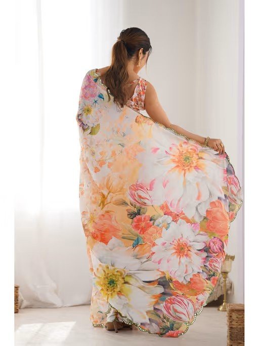 Multi-Color Yellow Digital Printed Chinon Saree with Unstitched Blouse