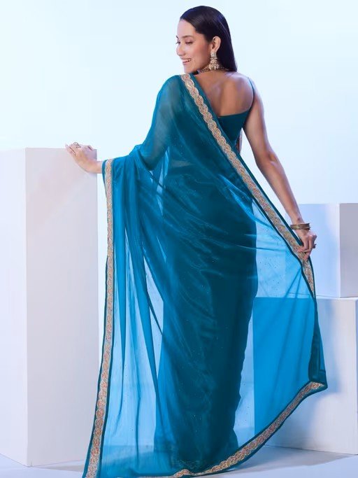 Wrap In Pure Bliss With This Blue Saree, Unstitched Blouse From Odette. Made From High Quality Net, It Features Embellished/Sequined Pattern. Pair It With Flats And Minimal Jewellery To Complete Your Ensemble.
