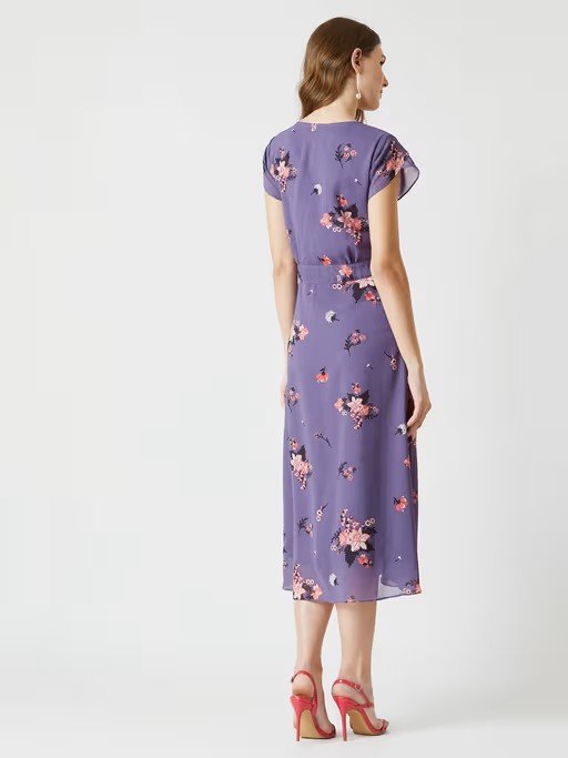 Multicolored base lavender floral pleated tie-up midi dress, Has a V-Neck and short sleeves, Has a zip closure.