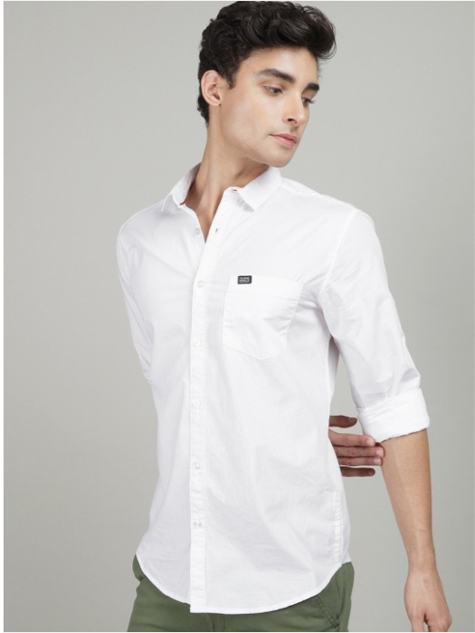 White solid opaque Casual shirt ,has a spread collar, button placket, 1 patch pocket, long regular sleeves, curved hem
