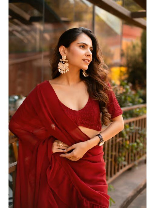 Carmine Maroon Georgette Embroidered Pre Stitch Saree Sharara with Unstitched Blouse