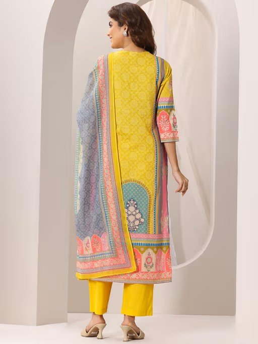 Yellow Printed Embroidered Straight Kurta with Pant and Dupatta
