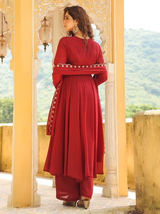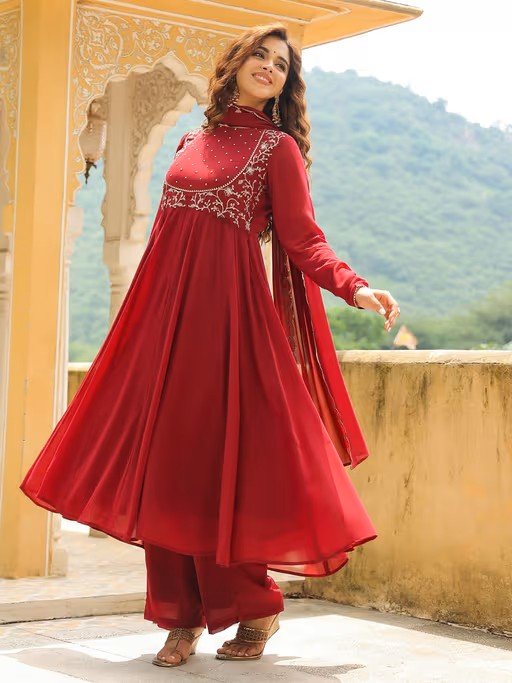 Women's Maroon Embroidered Anarkali Kurta with Palazzo and Dupatta (Set of 3)