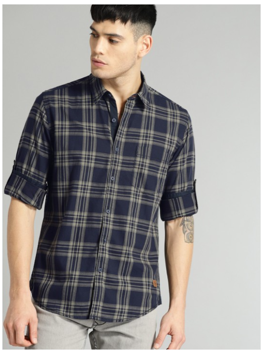 Blue and grey checked casual shirt, has a spread collar, long sleeves with roll-up tabs, curved hem, one patch pocket