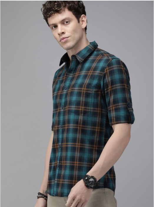 Navy Blue and Green checked casual shirt, has a spread collar, long sleeves, button placket, curved hem, and 1 patch pocket