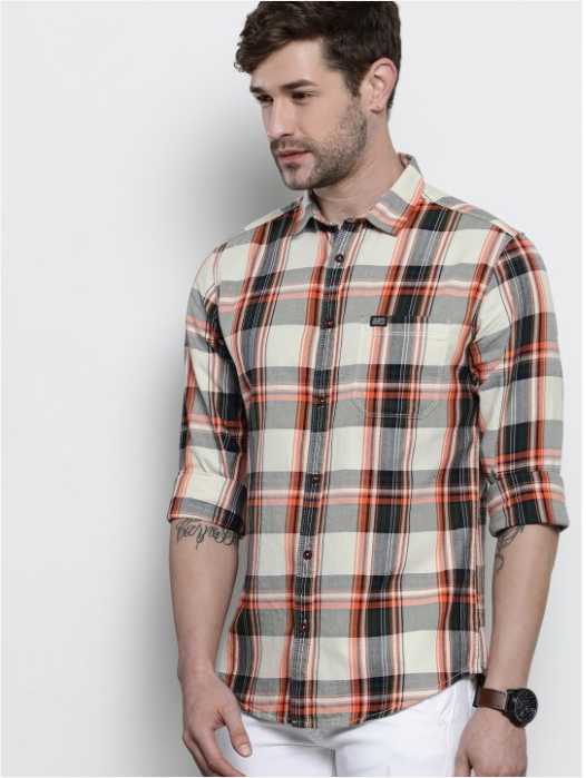 Cream-coloured tartan checks checked opaque Casual shirt ,has a spread collar, button placket, 1 patch pocket, long regular sleeves, curved hem