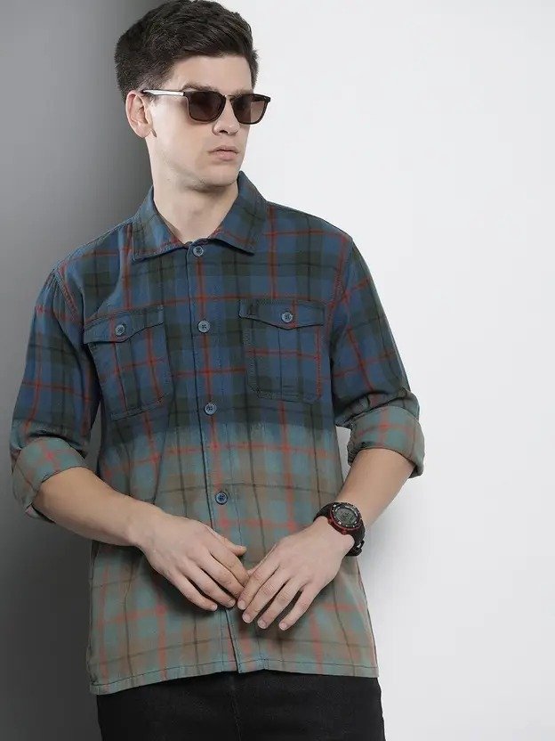 Men Regular Fit Checkered Lapel Collar Casual Shirt