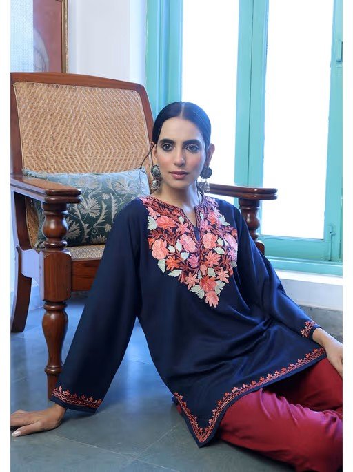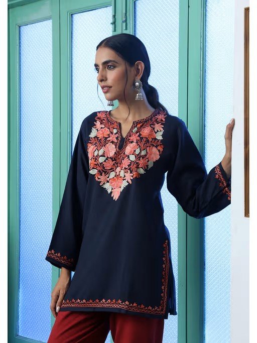 Crafts Aari Embroidered Cotton Womens Short Kurti - Navy Blue