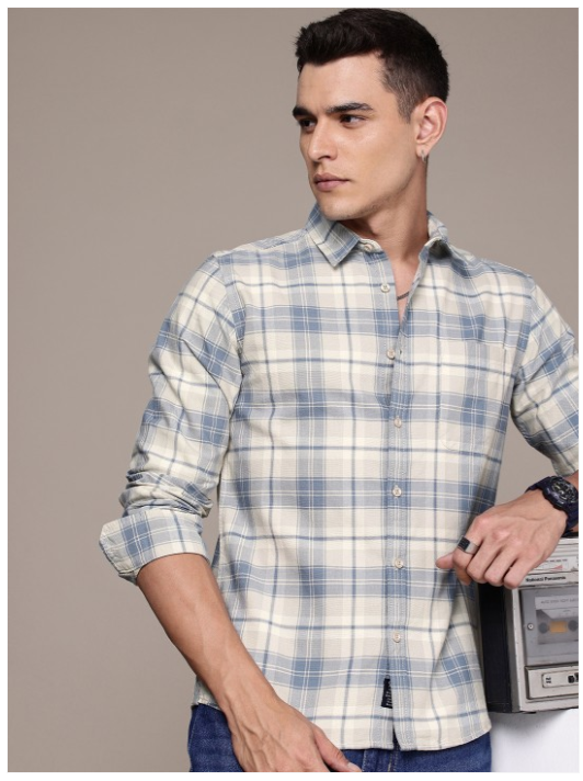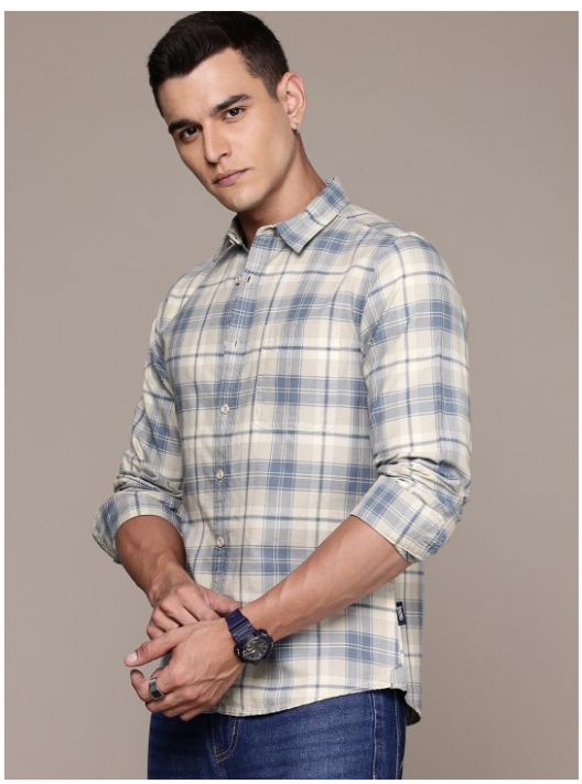 Grey other checks opaque casual shirt ,has a spread collar, button placket, 1 patch pocket, long regular sleeves, curved hem
