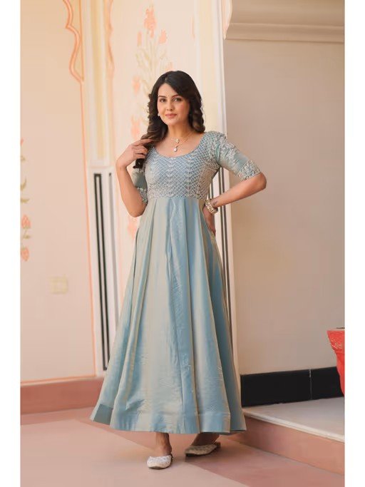 Elevate yours style with this blue gown from JATRIQQ. Crafted from silk, this beautiful gown is finished with half sleeves and a scoop neck. Style it with a pair of heels and stud earrings.