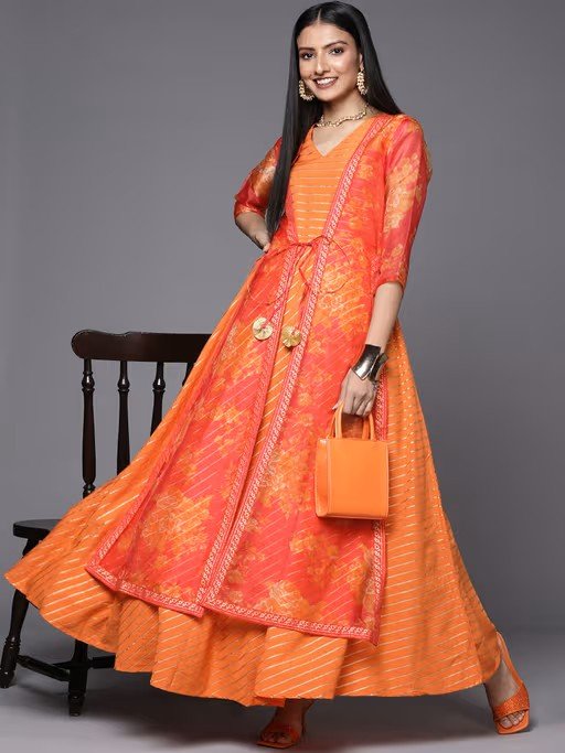 This is Orange Color dress made from crepe fabric with gold Glitter Print work. It has V Neck with 3/4 Sleeve, Kurta Length is 55".Disclaimer -The colours, appearing on your screen may differ slightly from the actual product. Let your Women flaunt her fashionable side with this clothing set from Ahalyaa. Comfy and stylish, it will make her look even more adorable.