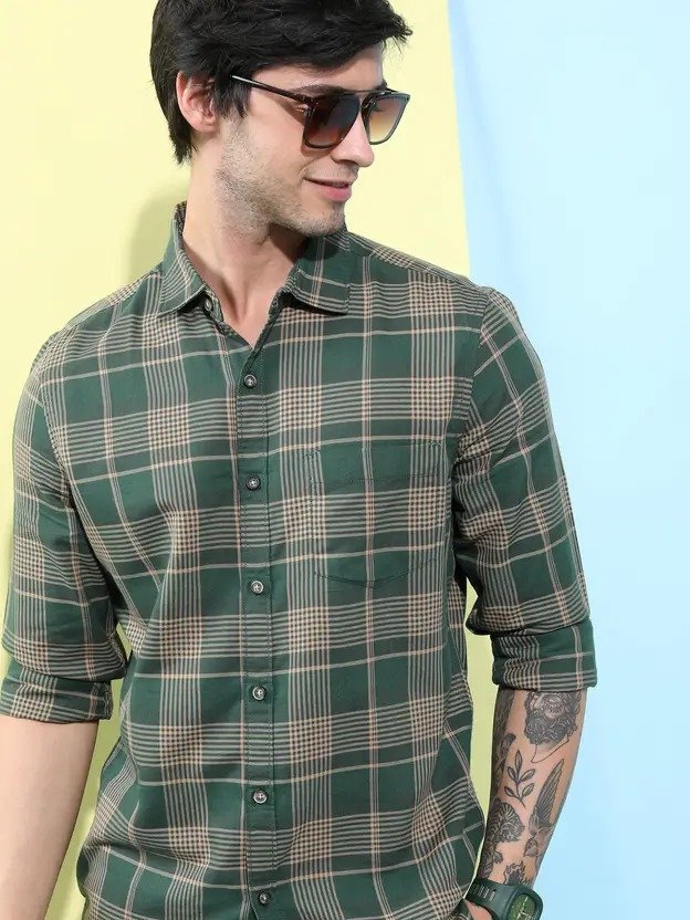 Men Slim Fit Checkered Cut Away Collar Casual Shirt