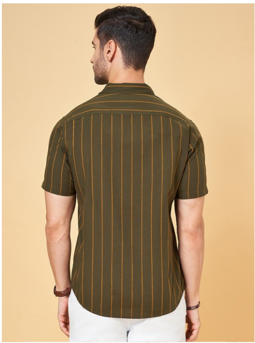 Olive green vertical stripes striped opaque Casual shirt ,has a spread collar, button placket, 1 pocket, short regular sleeves, curved hem
